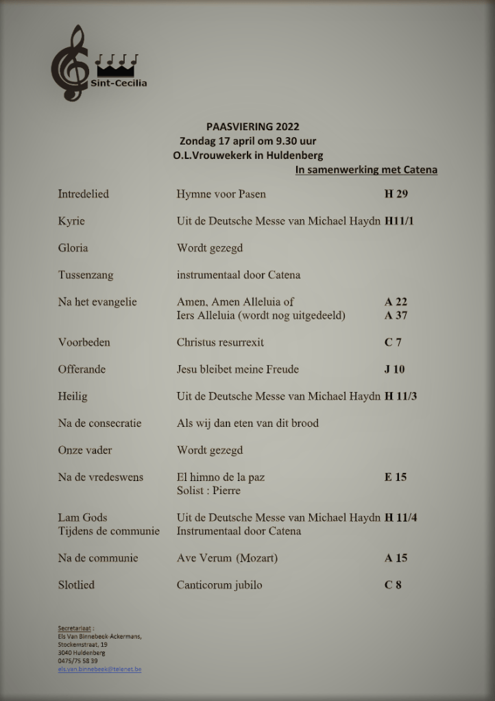 Gezien wij reeds een mooi programma voor de Paaswake opgesteld hebben, heeft het zangkoor van Overijse ons gevraagd om deze viering op te luisteren in Overijse.